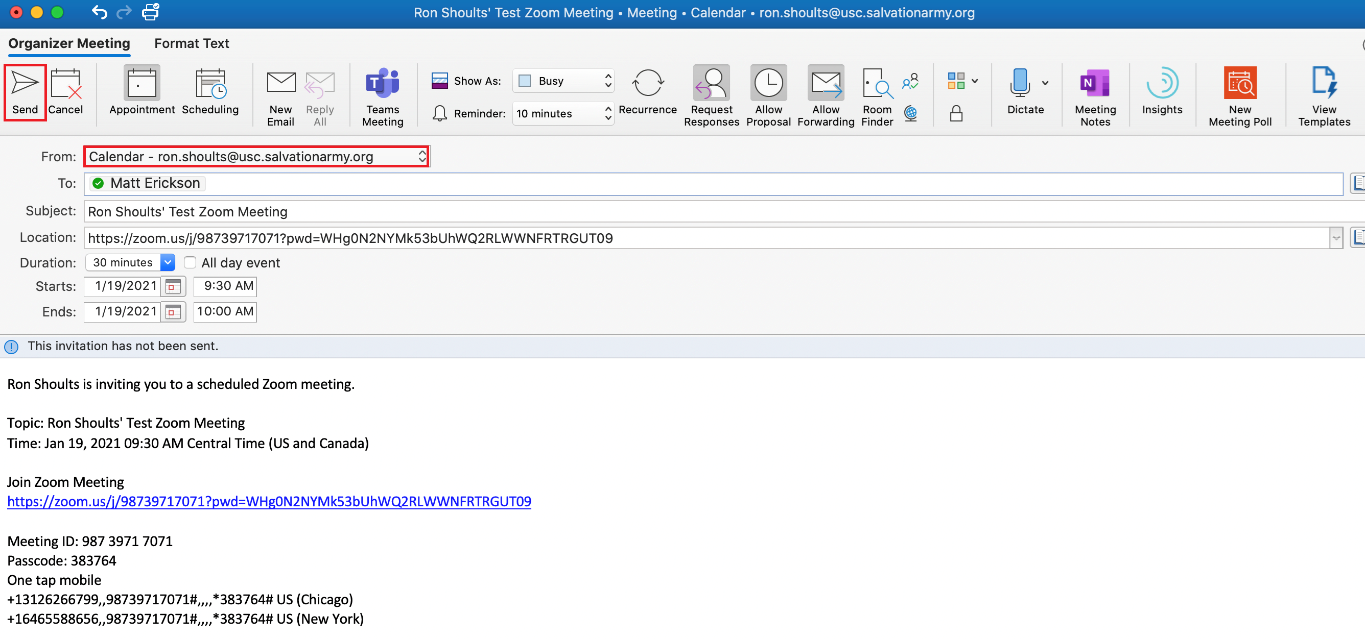You’ll remember that when you completed the “To:” fields the “Send” button was still grayed out. To fix that you need to change the “From:” field to your calendar entry. If you click on the drop down for that field and select “Calendar – Janice.howard@usc.salvationarmy.org” (for me the entry was at the top of the list) you should now be able to hit the “Send” button. The screen will look like: