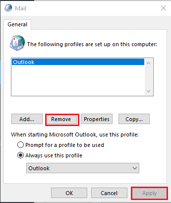 4) Make sure Outlook is selected and click on Remove button then click the Apply button