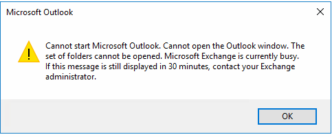 Cannot start Microsoft Outlook. Cannot open the Outlook window. The set of folders cannot be opened. Microsoft Exchange is currently busy. If this message is still displayed in 30 minutes