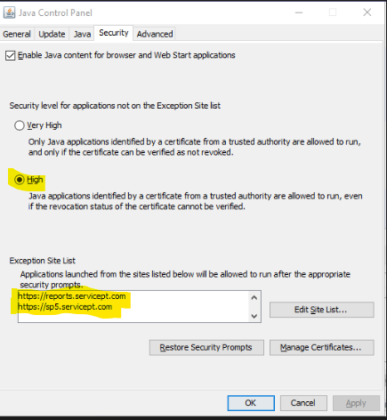 3) Go to Control Panel - Java - Security - Edit Site List