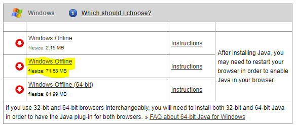 2) Choose the second option to download 32 bit version of Java