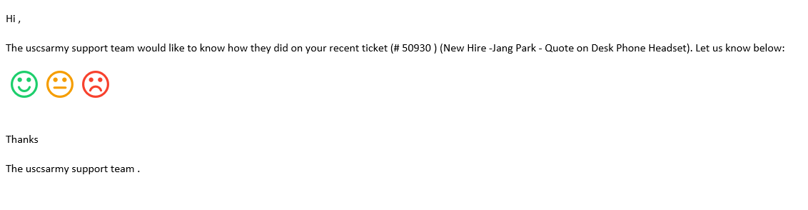 We have noticed that you appear to be trying to complete a survey on how our IT staff handled your recently closed ticket. Instead of completing the survey, it is apparent that you are simply replying to the e-mail which in turn creates a new ticket. Here is what the Survey e-mail looks "like": ![]() ______________________________________________________________________________________________________________ We understand that this is pretty vague. Unfortunately there is nothing we can do to change it. We are definitely interested in your feedback! Instead of "replying" to this message - simply click on the Face that best represents your rating of how our Salvation Army IT staff handled your ticket. Click on if you are happy with the service your received or if you are dissatisfied.When you click on one of these faces it will open up the survey page for you. It will automatically select the face you chose and give you an opportunity to add comments to your review. Once you fill out the comments (if you have any) click "Send" ![]() |