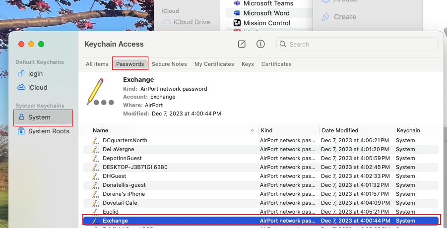 3) Scroll down and find the keychain that says Exchange. Right click on it and delete it. This stores the Microsoft 365 password.